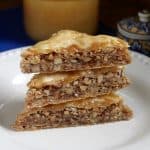 Heat honey until hot, then spoon over hot baklava as soon as it comes out of the oven. Allow to cool in tray on cooling rack. Keep at room temperature, covered with aluminum foil.