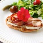 Form one rasher of bacon into a rose and the other into a bow (like the pink breast cancer bow, more of a loop), and place on the toast (with a flower, if desired) and serve with salad. Very simple, but most elegant.