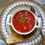 32 oz chilled tomato juice (I blended tomatoes and added some water) 2 medium tomatoes (or 1 large tomato) 1 large cucumber (or 3 or 4 small Persian cucumbers) ¾ green pepper 1 white onion (I used a sweet Vidalia) 3 cloves garlic (large, minced) 1 Tbsp red wine vinegar (I love vinegar, so I added more) 3 Tbsp extra virgin olive oil 2 tsp Kosher salt ⅛ tsp Tabasco sauce (to taste) ⅛ tsp black pepper (to taste) 1 slice avocado (optional to serve, as well as: sour cream, garlic croutons, or cooked shrimp)