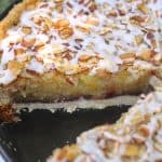 A classic British tart which has a jam base, cake like frangipane filling and almonds and icing on top. Delicious!